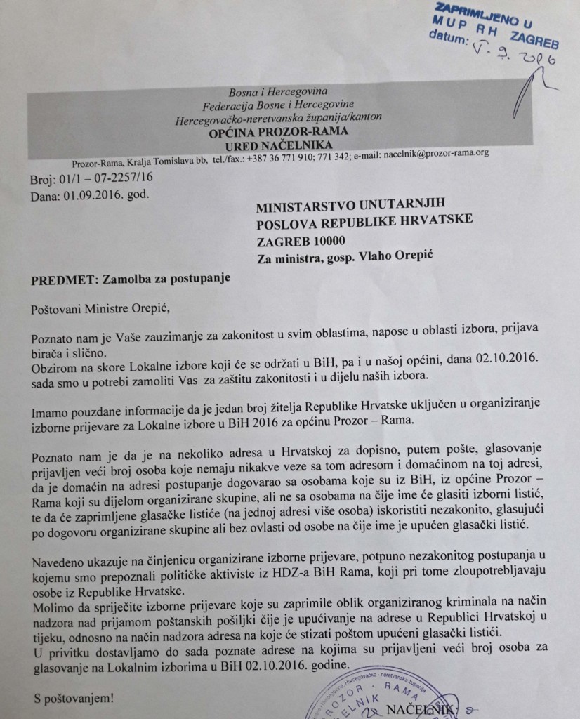 Općina Prozor-Rama je uputila dopis Ministarstvu unutarnjih poslova Republike Hrvatske tražeći zakonsko postupanje jer se u ovom izbornom inžinjeringu radi o organiziranoj prevari i kršenju ljudskih prava i zakona.